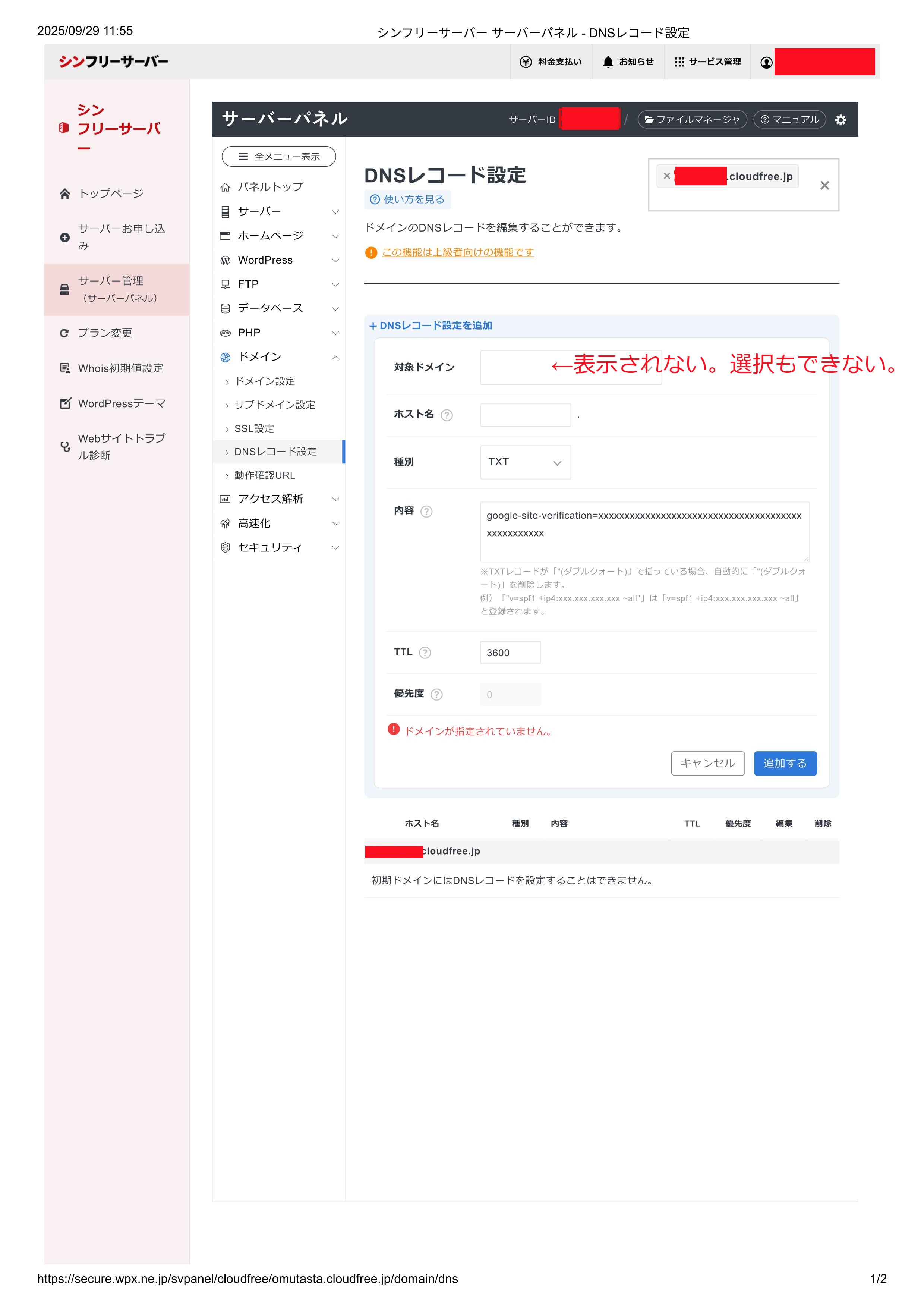 シンフリーサーバで新しくサイトを作成しました。Google検索でヒットするように、Google Search Consoleで「DNSレコードでのドメイン所有権の確認」をしようとしています。そのために、まずはシンフリーサーバ内で「DNSレコード設定の追加」をしようとしたところ、対象ドメインが表示されずプルダウン選択もできず、「追加する」ボタンを押しても「ドメインが指定されていません」とエラーが出てしまいます。ご助言お願いします。